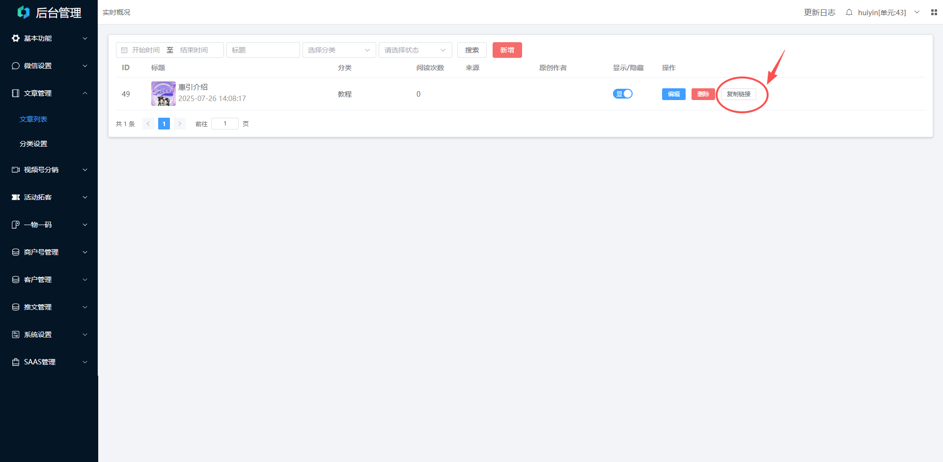打开后台->文章管理->文章列表,复制链接。
