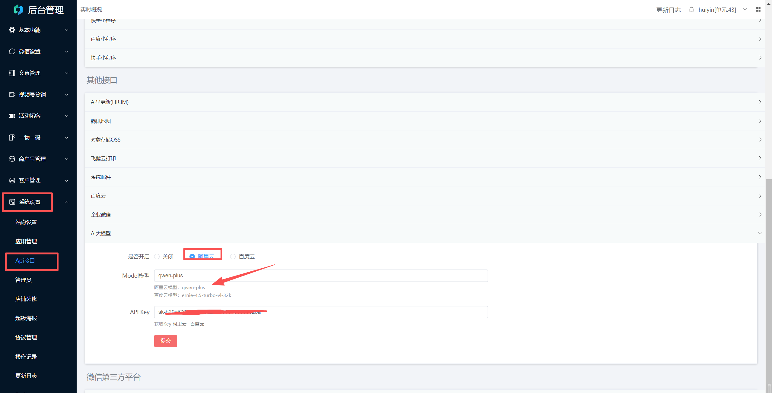 登录后台-->系统设置-->APi接口-->Ai大模型-->开启(阿里云)