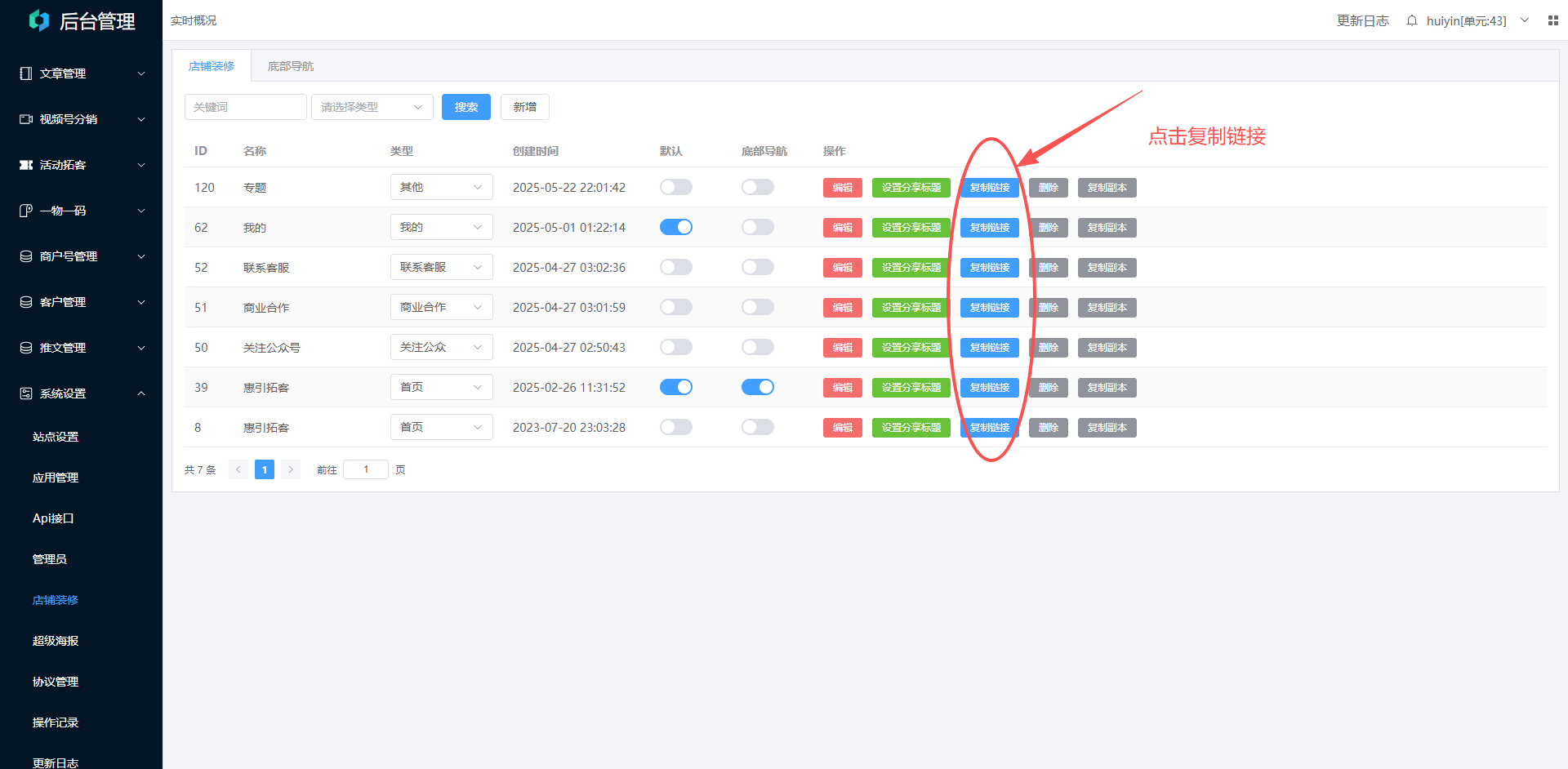 打开后台->系统设置->店铺装修,复制链接。